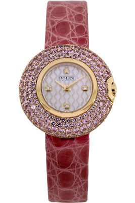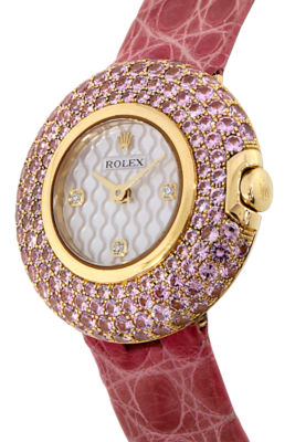 Bezel Material: 18K Yellow Gold, Set with Pink Sapphires